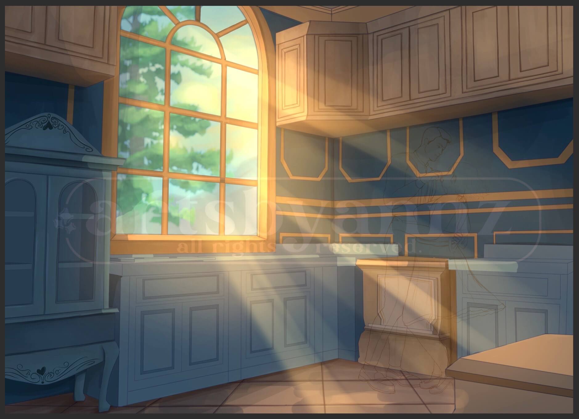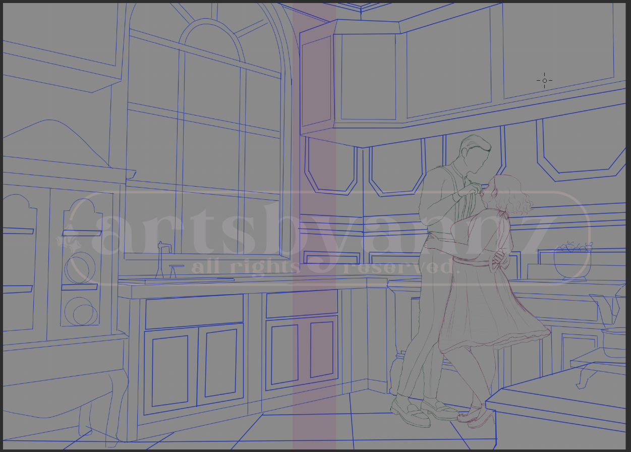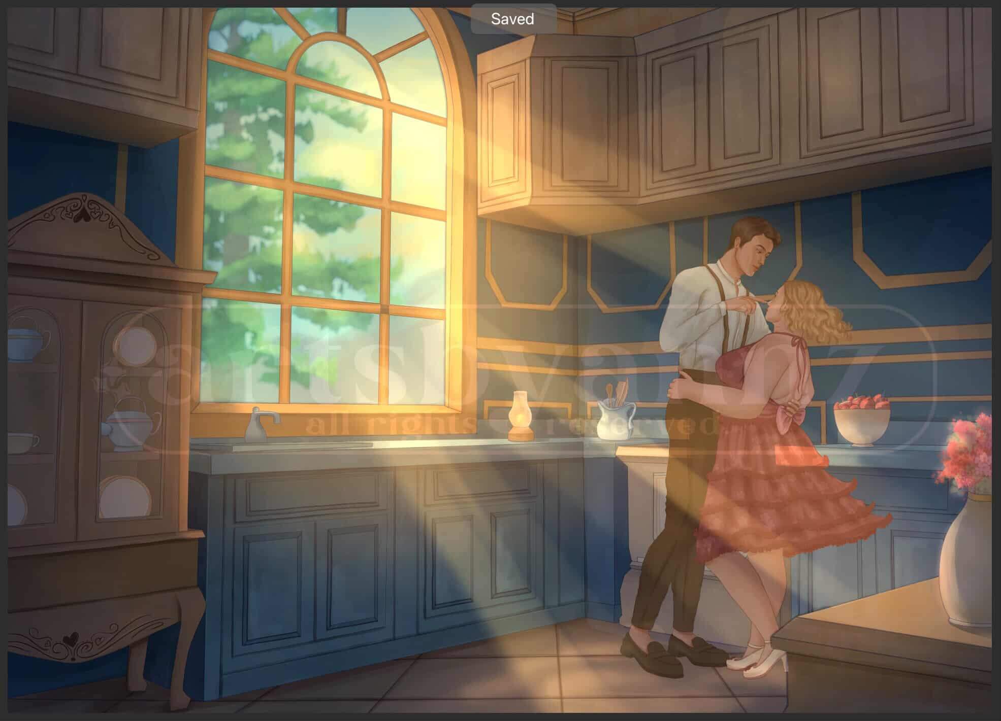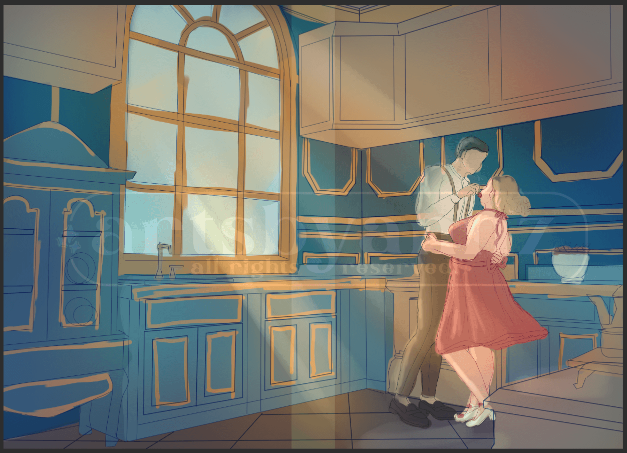 Here’s a snapshot on the illustration of the kitchen with and without the characters. Between the Victorian kitchen and the characters’ romantic pose, the kitchen really challenged me. There are quiet lot of details but I love how it all came together with the sunlight coming in from the window. Those rays are what I used to make it more whimsical and romantic. It really ties the piece together.